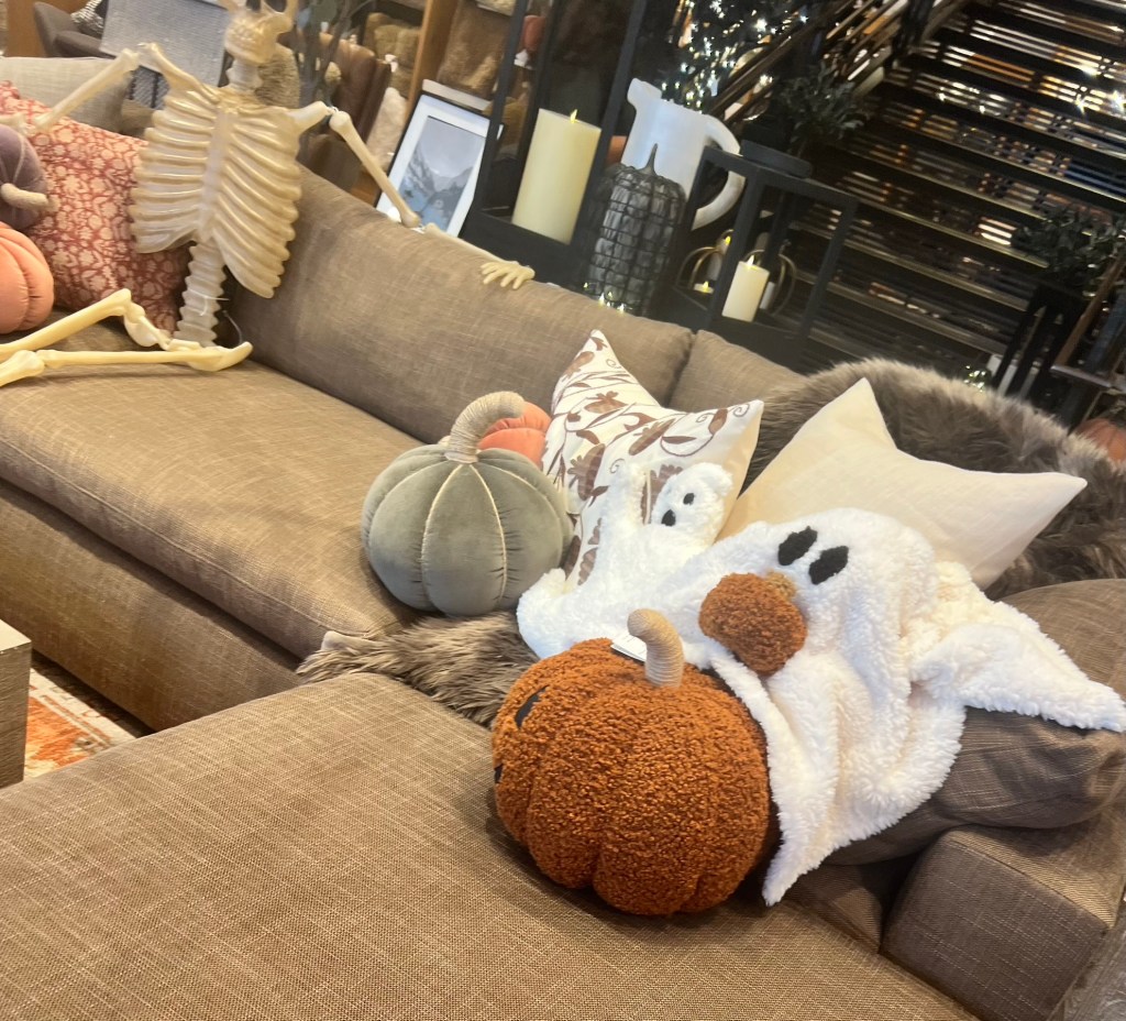 Another fun idea is adding a bit more festive layering with sofa throws and Halloween decorations. Adding shapes and textures will add special design touches and is also cozy for those movie nights.